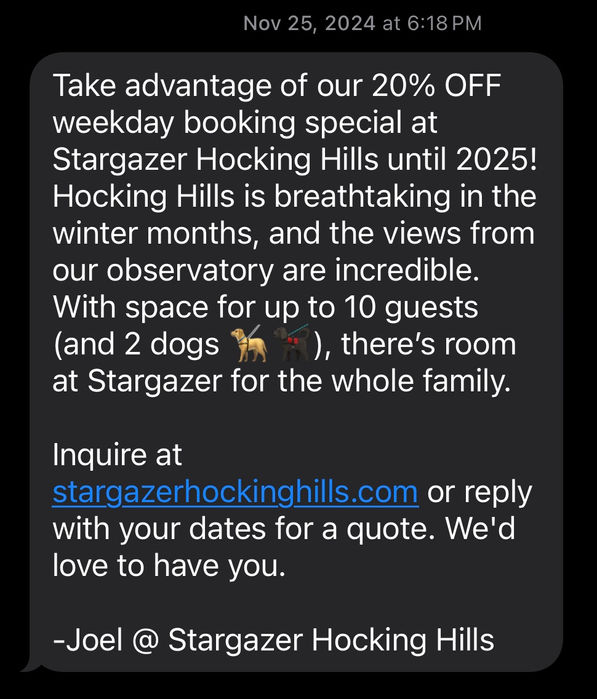 From September '24 through May '25 I served as the Team Lead for the Stargazer Hocking Hills ODMA team. I lead a group of 8 other students and helped to create branded content for email, text, social media, and web use for Stargazer Hocking Hills: a short-term rental cabin (with an observatory) in beautiful Hocking Hills, Ohio.